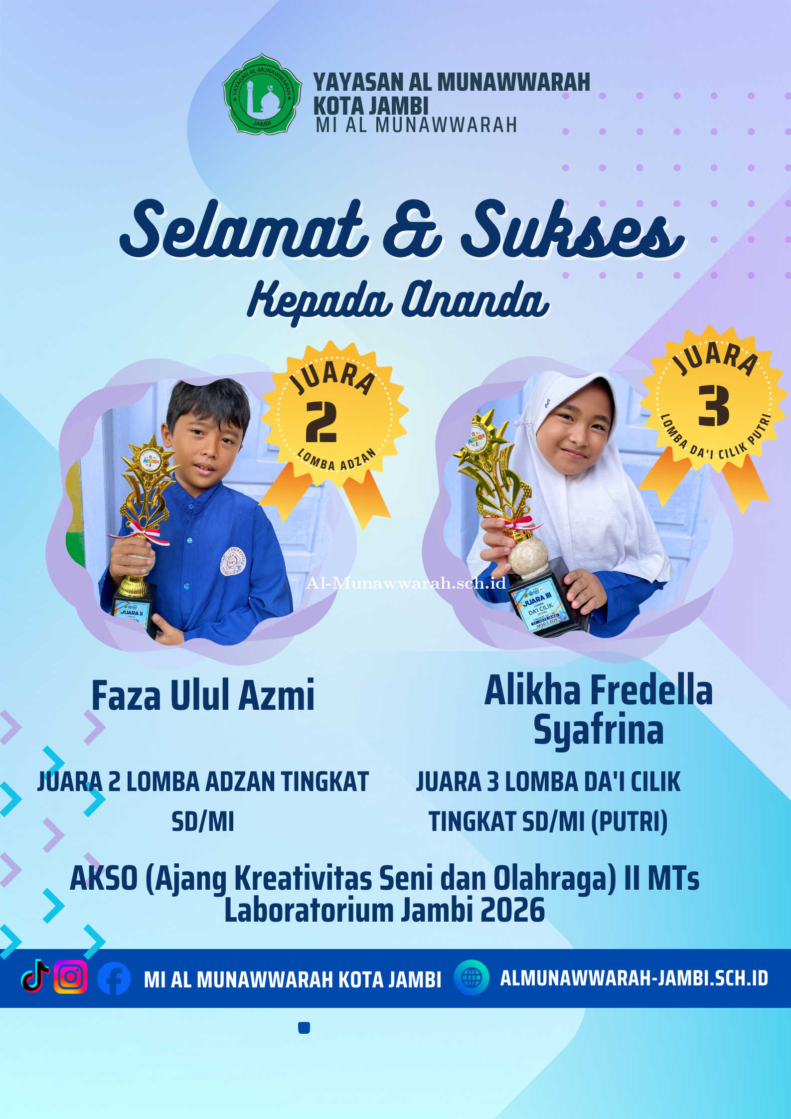 Selamat dan Sukses Kepada Siswa/i MI Al Munawwarah Kota Jambi Ananda Faza Uluk Azmi yang mendapatkan Juara 2 Lomba Adzan Tingkat . . . 0